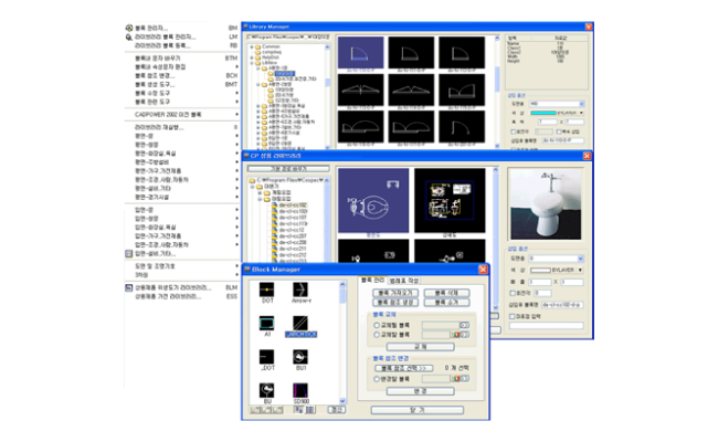 2D/3D/동적 블록 및 상용화 블록 등 약 2500여 개의 다양한 블록 라이브러리를 제공하고 이 블록들을 도면에 쉽게 추가할 수 있는 기능과 사용자 블록을 만들어 추가할 수 있는 기능 제공