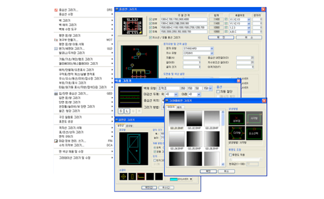 중심선/기초/기둥/벽/슬래브/천정/문/계단/주차장/엘리베이터 등 건축 객체들을 쉽게 작성할 수 있는 기능을 제공하고 면적/일람표/구적표/그라데이션/기호/부호/표식 등 건축 설계에 필요한 다양한 그리기 기능 제공