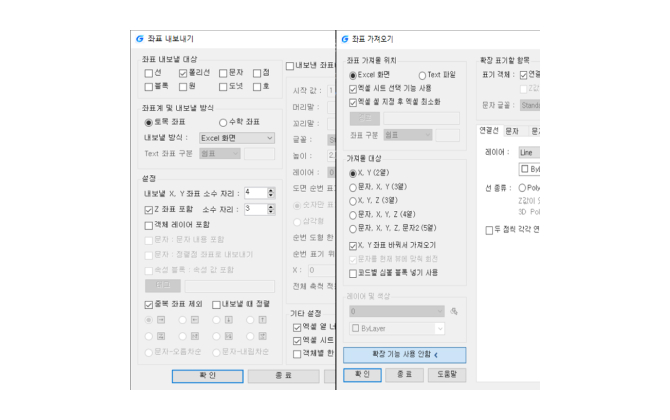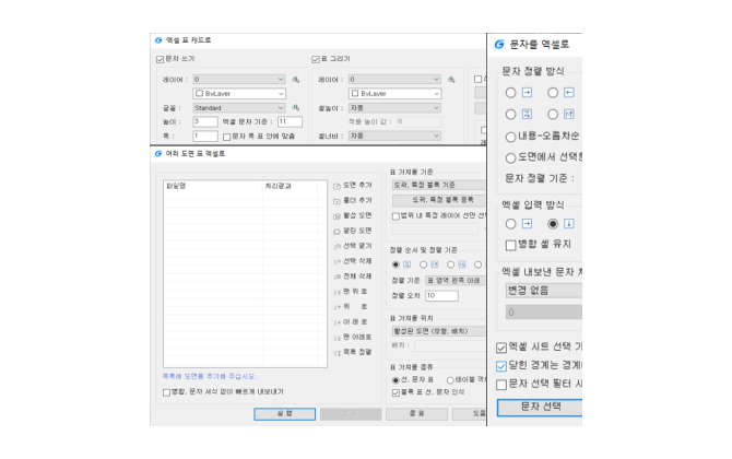 엑셀표 캐드로, 캐드표 엑셀로, 문자를 엑셀로, 순번 좌표 내보내기 등 엑셀과 연동되는 기능을 지원합니다.