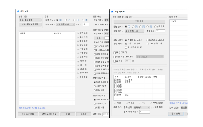 도면 번호쓰기, 도면 목록 엑셀로, 도면 분할, 다중도면 삽입, 속성도곽 일괄수정 등 다중 처리가 가능합니다.